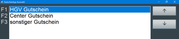 Über die Funktion "Nicht Regi. (F3)" werden alle externen Gutscheine oder Fremdgutscheine verarbeitet, die nicht über Siller POS selbst erzeugt und ausgestellt wurden. Dies betrifft alle Gutscheine, die nicht mit einem kasseneigenen Barcode versehen sind. Über die "Einstellungen" – "Gutschein-Verwaltung" können Gutscheintypen für die nicht registrierte Gutscheineinlösung festgelegt werden. Diese werden nach Auslösen dieser Funktion in einer Auswahlmaske angeboten.