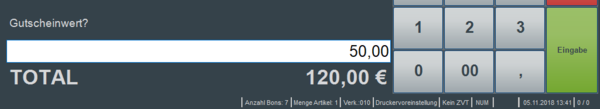 Nach Auswahl des entsprechenden Gutscheintyps wird der Gutscheinwert abgefragt und erfasst.