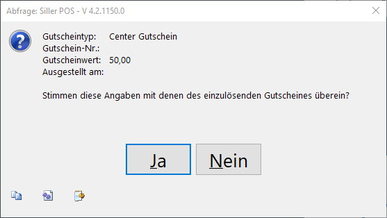 Anschließend erscheint eine Rückfrage, in der einige Informationen zum erfassten nicht registrierten Geschenkgutschein angezeigt werden.