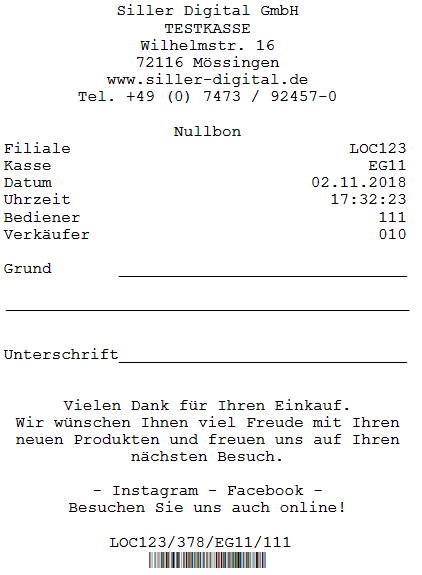 Nullbon (F4)" erzeugt. Die Geldlade öffnet sich.