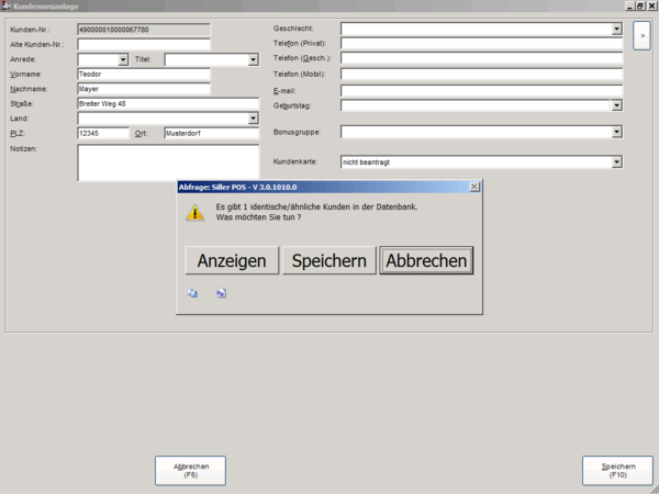 Der bereits existierende Kundendatensatz wird zur Überprüfung ange-zeigt. Im weiteren Verlauf kann entschieden werden, ob der Neukunde tatsächlich angelegt werden soll.