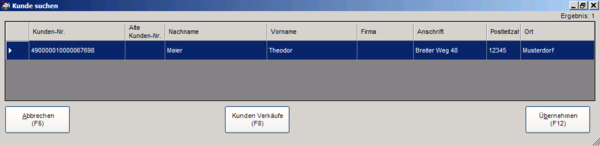 Es besteht hier nun die Möglichkeit, einen der gefundenen Kunden in den Kassenbeleg zu übernehmen (Button "Übernehmen (F12)"), oder alternativ die Funktion abzubrechen (Button "Abbrechen (F5)"). Die in der Neukundenanlage erfassten Daten werden durch die Übernahme eines Kunden aus dieser Maske verworfen.