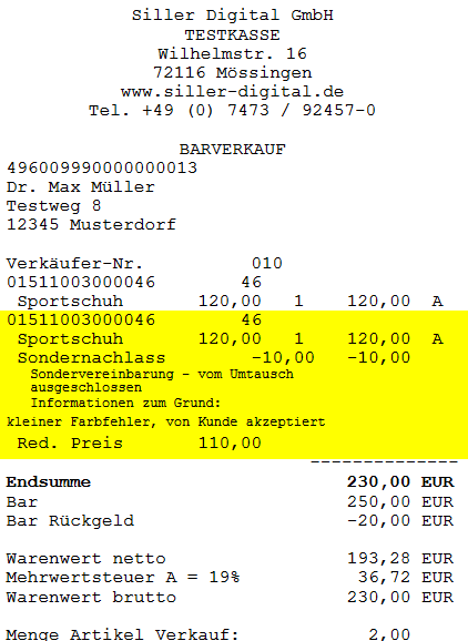 Sowohl der Grund als auch der zusätzlich erfasste Freitext wird im Standard auf dem Kassenbeleg angedruckt. Ist dies nicht gewünscht (sollen also die hier erfassten Informationen ausschließlich für nachgelagerte Systeme zur Auswertung zur Verfügung gestellt werden), muss das Beleglayout entsprechend modifiziert werden.