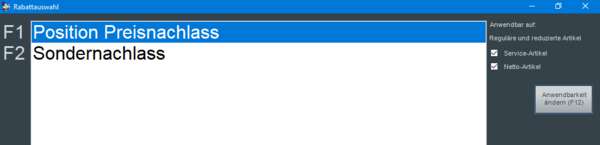 Anwendungs-Parameter besteht die Möglichkeit, grundsätzlich oder für eine entsprechende Berechtigungsstufe einen Button "Anwendbarkeit ändern (F12)" einzublenden. Hierüber ist es möglich, dass in Einzelfällen die Anwendbarkeit einer Reduktionsart geändert werden kann. Dadurch ist dann die gewählte Reduktionsart dennoch anwendbar (die Einstellungen der Kasse werden dadurch für diesen Einzelfall übersteuert).