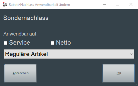 Ist diese Option deaktiviert, kann die gewählte Reduktionsart nicht auf Artikel angewendet werden, die als Service bzw. Dienstleistung deklariert sind.