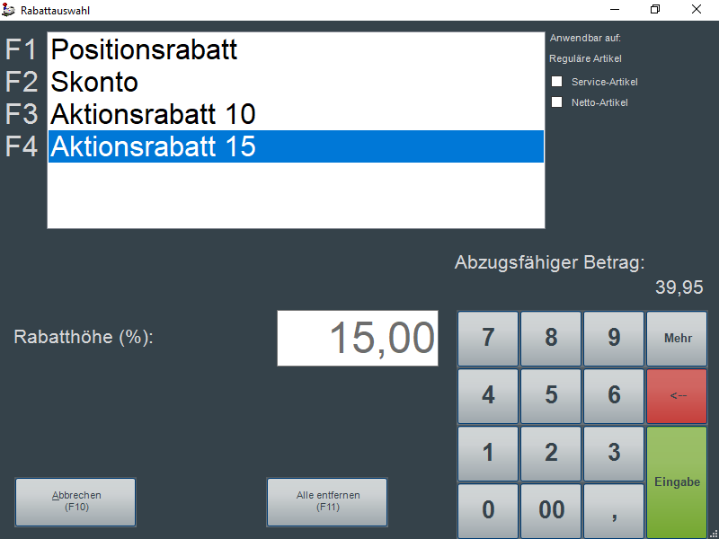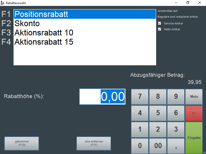 Zunächst wird die gewünschte Rabattart in der Maske gewählt. Anhand der Informationsanzeige "Abzugsfähiger Betrag"lässt sich erkennen, ob die gewählte Rabattart auf diese Position anwendbar ist. Wird hier ein Wert 0,00 angezeigt, lässt sich die gewählte Rabattart auf diese Position nicht anwenden, da die Rabatteinstellungen in den vordefinierten Einstellungen der Kasse die Anwendbarkeit verhindern.