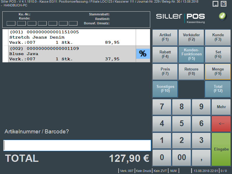 Über den Button "Rabatt (F4)" oder die Taste F4 in der Positionserfassung kann auf die aktive / markierte Belegposition ein Rabatt vergeben werden. Wird keine Position aktiv ausgewählt, so ist automatisch die zuletzt erfasste Position im Bearbeitungsmodus und wird durch die Rabattvergabe angepasst.