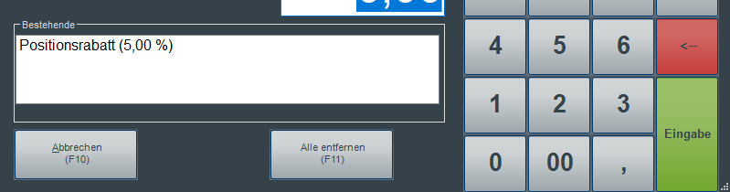 Versehentlich vergebene Rabatte oder Reduktionen auf Positionsebene können wieder entfernt werden, indem über Button "Rabatt (F4)" die Rabattmaske aufgerufen wird. Dort lassen sich über den Button "Alle entfernen (F11)" die bereits vergebenen Rabatte und Reduktionen auf die betreffende Position vollständig entfernen.