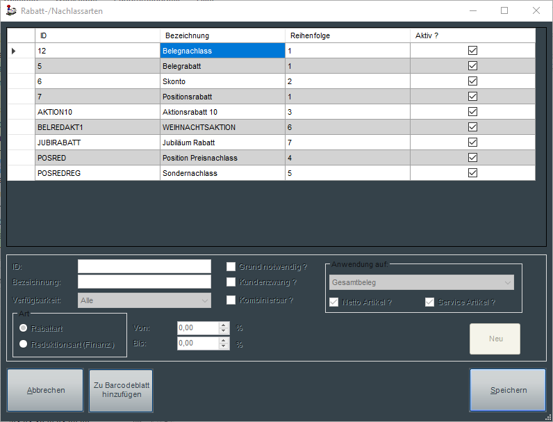 Bezeichnung der Rabatt-/Nachlassart; wird auf dem Kassenbeleg ausgegeben und in der Kassenabrechnung erfolgt eine Gruppierung auf diese Rabatt-/Nachlassart