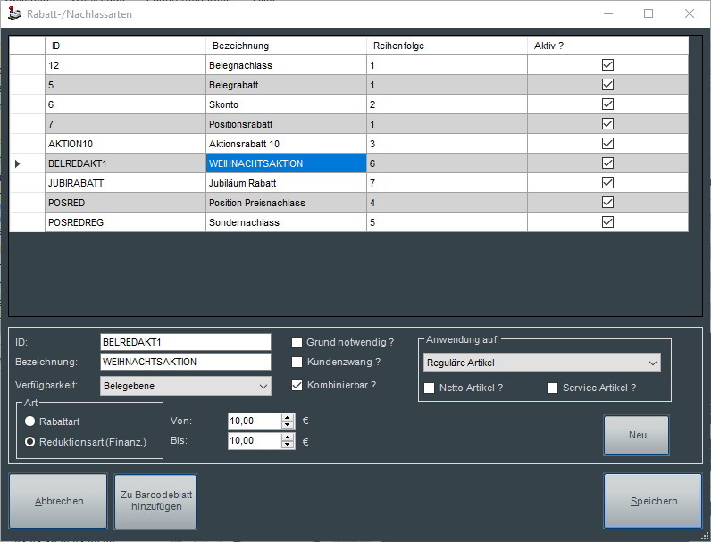 Es ist über die Einstellungen in von / bis möglich, sowohl feste Rabatte / feste Reduktionswerte zu setzen (Festrabatt, Festreduktion), als auch individuell im Einzelfall durch den Anwender definierbare variable Rabatte bzw. Reduktionswerte zu hinterlegen. Eine individuelle Änderung im Beleg ist im Standard nicht möglich.
