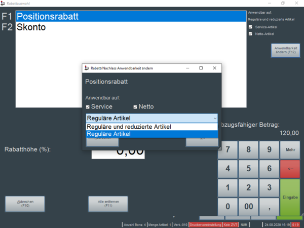 Durch den Bediener der Kasse darf je Anwendung der Rabattart ein individueller Rabatt zwischen 0,00% und maximal 20,00% auf Basis des abzugsfähigen Betrags vergeben werden.