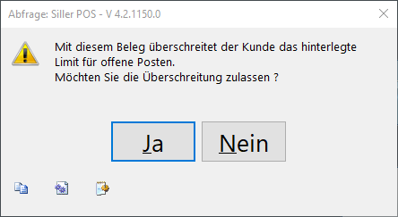 Über die Einstellungen kann festgelegt werden, ob das offene Restlimit (wird während der Belegerfassung im Bereich Kunde dargestellt) lediglich angezeigt werden soll, oder ob bei Überschreitung des Limits die Erfassung weiterer Belege ohne Sofortzahlung (Rechnungen und Auswahlen) eine Prüfung durch ein höheres Benutzerrecht oder eine Sperre des Vorgangs erfolgen soll (siehe auch "Rechteverwaltung").