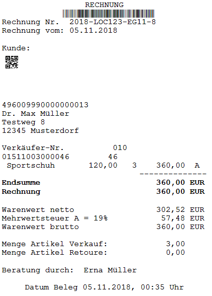 Auf dem Rechnungsbeleg befindet sich ein Funktionsbarcode, mit dem durch einen einzigen Scan die Zahlung einer Rechnung möglich ist. Dieser Barcode wird in der Erfasszeile während der Positionserfassung gescannt. Es wird damit automatisch eine Rechnungszahlung über den Rechnungswert ausgelöst sowie der Kunde dem Beleg zugeordnet (alternativ kann die Rechnungszahlung auch über die Funktion "Rechnungszahlung (F8)" oder über "Einnahme (F4)" – "Rechnungszahlung" aufgerufen werden – siehe "Rechnungszahlung" oder "Einnahme").