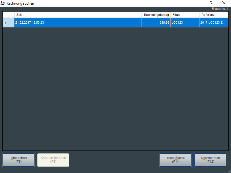 Der Button "Abbrechen (F5)" bricht die Funktion Rechnungszahlung ab. Wurde dem Beleg bereits zuvor ein Kunde zugeordnet, werden dessen unbeglichene Rechnungen angezeigt. Sofern dem Vorgang noch kein Kunde zugeordnet wurde, wird nun zwingend eine Kundenzuordnung abgefragt. Anschließend werden die noch nicht beglichenen Rechnungen des (im Beleg) gewählten Kunden angezeigt: