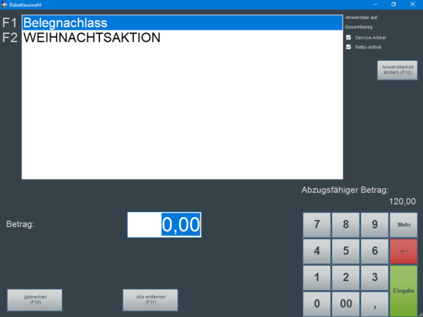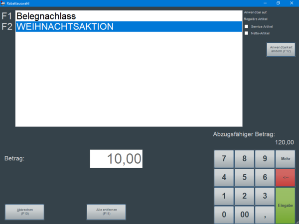Die Anwendung der Reduktionen erfolgt analog der Beschreibung für Rabattarten (siehe "Belegrabatt (F5)"). Auch die Einschränkungen, wie beispielsweise die Kombinierbarkeit, gelten für Reduktionsarten analog der Beschreibung für Rabattarten.