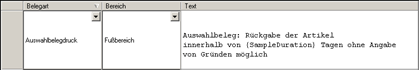 Der hier festgelegte Wert wird bei Auswahlerstellung als Standardwert für die Auswahldauer (in Tagen) angezeigt und kann auch auf dem Kassenbeleg angedruckt werden. Für den Andruck auf dem Kassenbeleg erforderlich ist die Definition eines Belegfußes für Auswahldruck (siehe auch Bon-Bereiche) und die dortige Verwendung des Platzhalters {SampleDuration}, der für die erfasste Auswahldauer steht. Dies ist die bei Auswahlerstellung in der Kassenanwendung vorgeschlagene Dauer in Tagen. Eine individuelle Änderung je Auswahlbeleg ist im Rahmen der Auswahlerfassung individuell pro Belegmöglich.