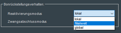 ![]() Für die Funktion "Bon parken (F9)" kann ein zentraler Rückstellungsort (unternehmens- oder filialweit) definiert werden. Mit diesen Einstellungen kann der Prozess der Rückstellung konkreter spezifiziert werden. Wurde ein Beleg zentral geparkt, kann über den Reaktivierungsmodus festgelegt werden, ob bei der Weiterbearbeitung des Beleges ("Bon reaktivieren (F12)") nur Belege übernommen werden können, die lokal an der jeweiligen Kasse geparkt wurden. Alternativ stehen auch die Optionen filialweit oder global (= unternehmensweit) zur Verfügung. Hierüber ist es möglich, auch Beratungs- oder beispielsweise auch eine Vorerfassungs- / Stockwerkerfassung z. B. in Verbindung mit Warentransportsystemen zu konfigurieren.