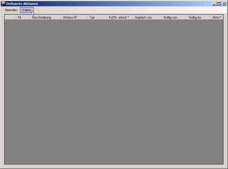Diese Maske zeigt alle derzeit in Ihrem Unternehmen aktiven Aktionen. Bei neuausgeliefertem Zustand enthält diese Ansicht keine Daten.