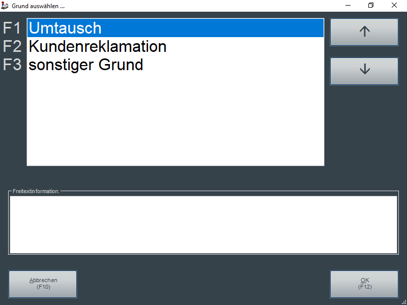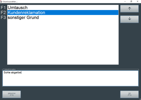 Zusätzlich kann zum gewählten Retoure-Grund ein Freitext erfasst werden. Dieser Freitext wird ebenfalls auf dem Kassenbeleg angedruckt.