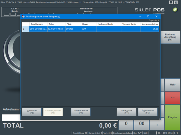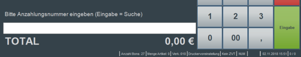 Alternativ kann über den Button "Eingabe" oder die Taste ENTER ohne Erfassung der Nummer auch in die Suche der offenen Anzahlungen gewechselt werden.