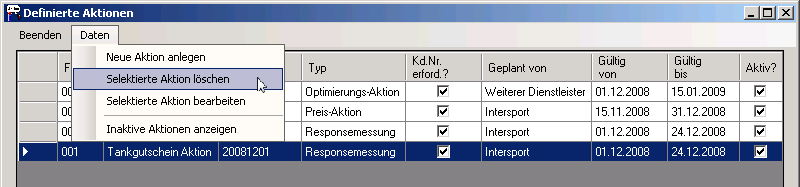 Um eine angelegte Aktion zu löschen, muss diese in der Übersichtsmaske markiert werden. Anschließend kann diese über den Menüeintrag "Daten" – "Selektierte Aktion löschen" aus dem System entfernt werden.