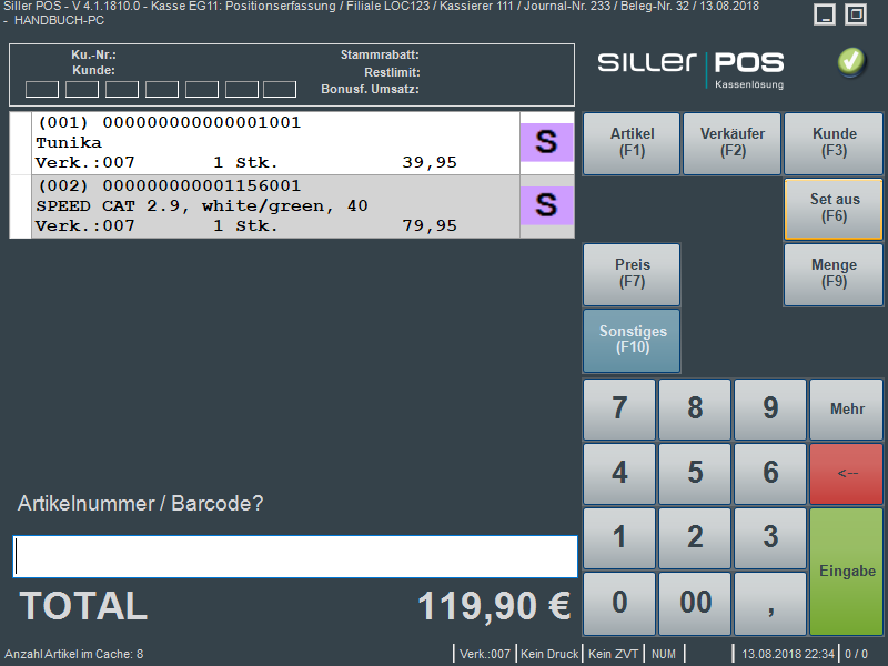 Im Beleg können mehrere Verkaufssets erfasst werden. Jedem Setartikel wird auf dem Kassenbeleg eine eindeutige Set-Nummerierung zugewiesen. Eine Information über die im Beleg enthaltenen Verkaufssets ist im Fußbereich des Beleges aufgeführt.
