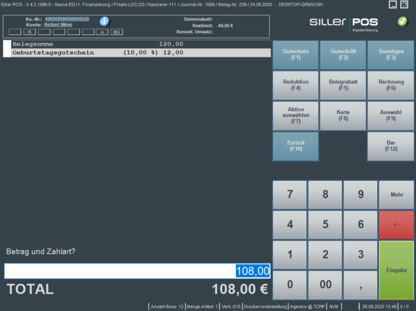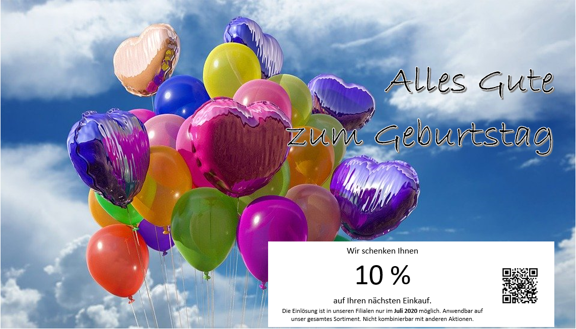 Es werden alle Kunden im Geburtstagsmonat mit einem Geburtstagsgutschein in Höhe von z. B. 10,00% auf den Einkaufswert bei Einlösung oder in Form eines Wertguthabens von 10,00 EUR überrascht. Die Erzeugung und der Versand der Geburtstagsgutscheine erfolgt extern (außerhalb der Kassensoftware) auf Basis der Kundenkonten.