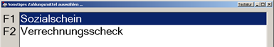 Über die "Einstellungen" – "Sonstige Zahlungsmittel" können sonstige Zahlungsmittelarten angelegt werden, die dann bei Aufruf der Funktion "Sonstige ZM (F3)" zur Auswahl angeboten werden. Sind keine Zahlungsmittelarten angelegt, erfolgt die Buchung immer auf das im Standard verfügbare "sonstiges ZM".
