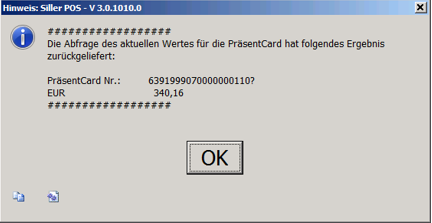 Die Abfrage des aktuellen Kontostandes einer elektronischen Gutscheinkarte ist über diese Funktion möglich und wird über das angeschlossene Zahlungsverkehrsterminal (Kartenzahlungsterminal) durchgeführt. Während der Abfrage sind die Meldungen am Terminal zu beachten. Die abschließende Information wird in einer Hinweismeldung angezeigt und zusätzlich, abhängig von Einstellungen des Zahlungsverkehrsterminals (Kartenzahlungsterminal), dort ausgedruckt.