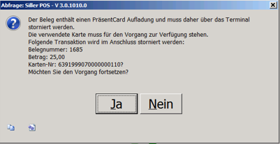 Wird der Verkaufsbeleg abgebrochen, erscheint der entsprechende Hinweis, dass die im Beleg enthaltene elektronische Gutscheinkarte rückabgewickelt werden muss. Sofern der Abbruch des Beleges tatsächlich durchgeführt werden soll, muss diese Meldung über den Button "Ja" bestätigt werden. Dadurch wird auch die Erfassung der elektronischen Gutscheinkarte über das Zahlungsverkehrsterminal (Kartenzahlungsterminal) storniert. Auch hier sind die entsprechenden Anweisungen am Terminal zu beachten. Für diesen Vorgang muss die betreffende elektronische Gutscheinkarte vorliegen. Es besteht die Möglichkeit, den Abbruchvorgang an dieser Stelle über den Button "Nein" abzubrechen.