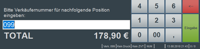 Über den Button "Verkäufer (F2)" oder Funktionstaste F2 auf der PC-Tastatur kann für die im Beleg nachfolgenden Positionen ein Verkäufer zugeordnet werden. Die Verkäufernummer wird in der Erfasszeile eingegeben und über den Button "Eingabe" / die Taste "Enter" bestätigt.