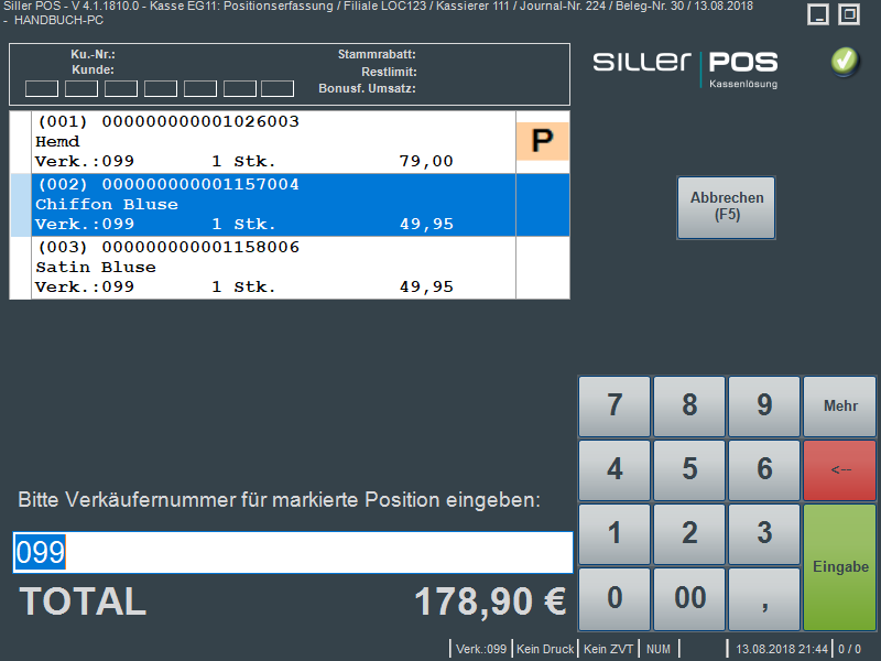 Die zuletzt eingegebene Verkäufernummer wird für die nachfolgenden Positionen im Beleg verwendet. Die Zuordnung bleibt solange erhalten, bis wieder eine Änderung der Verkäufernummer über den Button "Verkäufer (F2)" oder Funktionstaste F2 auf der PC-Tastatur durchgeführt wird.